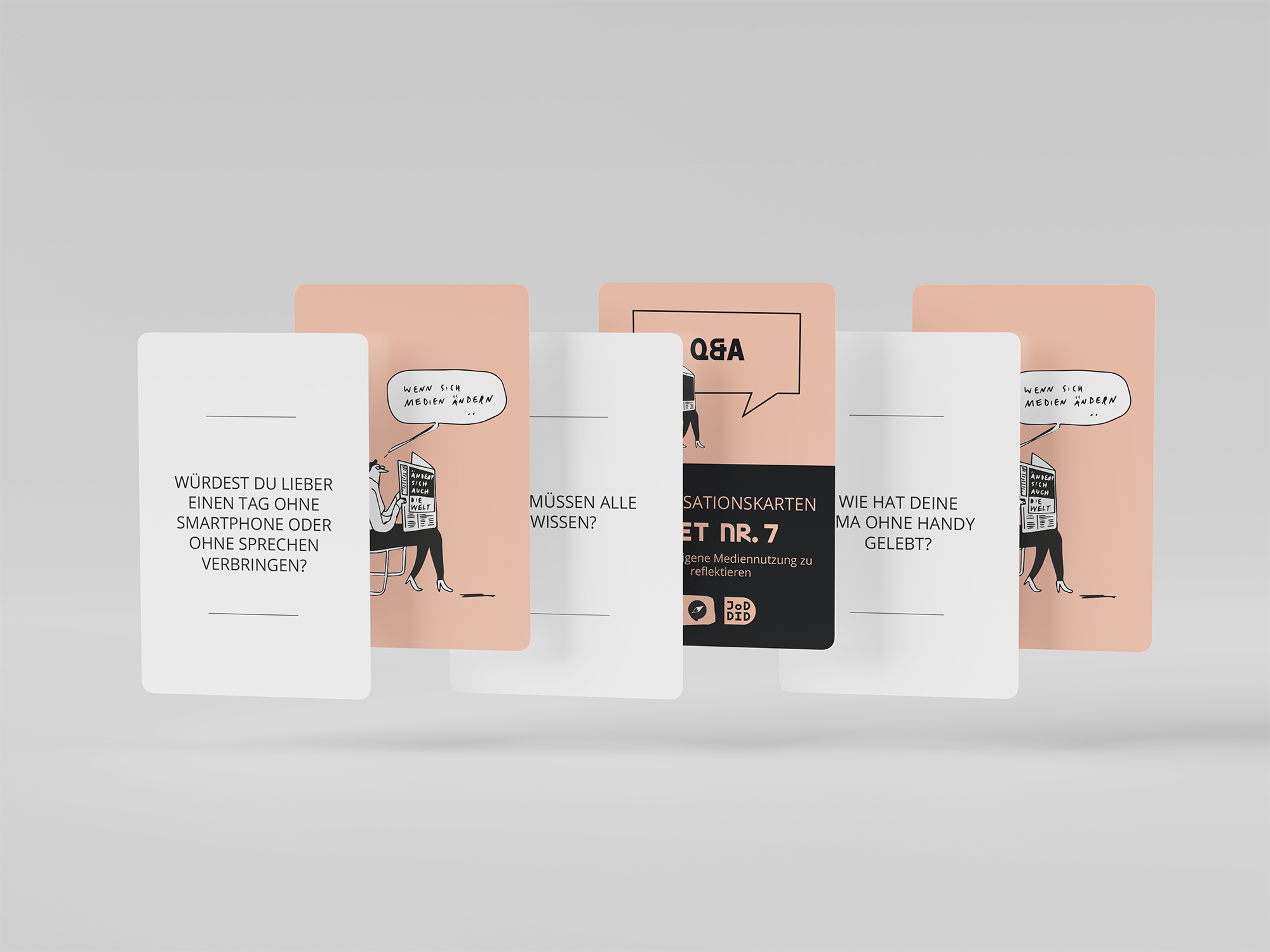 Die John-Dewey-Forschungsstelle für die Didaktik der Demokratie (JoDDiD) trat an uns heran, da sie gern ein weiteres Kartenset für ihre Konversationskarten entwickeln wollte, diesmal mit dem Schwerpunkt Medienbildung. Da waren wir natürlich sofort dabei und kurze Zeit später fanden wir uns in einem gemeinsamen Brainstorming wieder, in welchem wir zusammen die Fragen erarbeiteten, die später von der JoDDiD auf die Karten gebracht wurden.