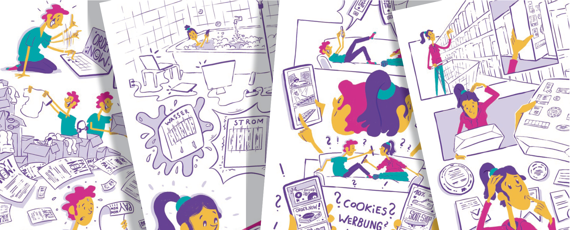 Das Herzstück der Ausbildung ist der „Action Planner“ – ein Arbeitsheft, in dem die Lernenden die Lerninhalte der Ausbildung vertiefen können und gleichzeitig angeleitet werden, ihre erste eigene Aktion zu planen. Um möglichst nah an den Wünschen und Bedürfnissen der Peer-Scouts konzipieren zu können, veranstalteten wir in der Anfangsphase der Konzeption zwei partizipative Co-Creation-Workshops. Zusätzlich zum Action Planner erstellten wir zwei Erklärvideos und Comics zu den vier Themen der Verbraucherbildung. Das Workshop-Konzept setzten wir später grafisch in einem umfassenden Trainer:innen-Guide um.